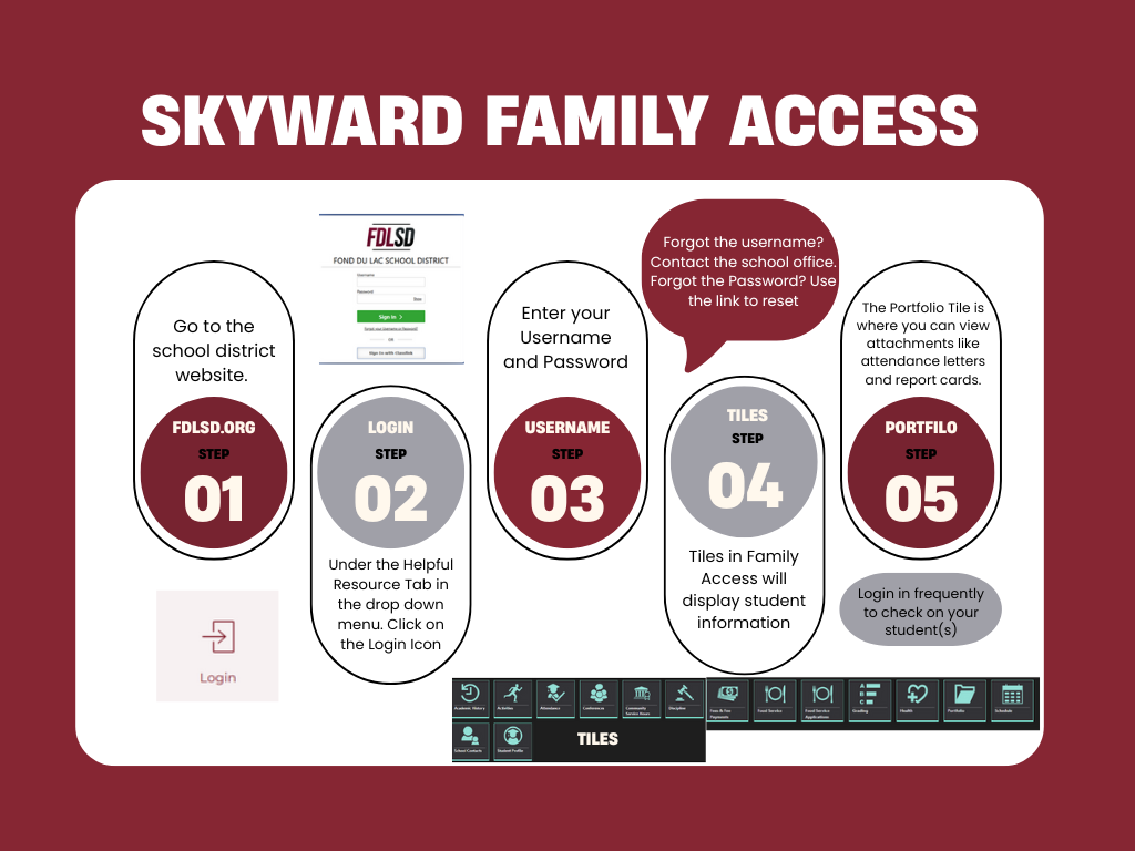In efforts to ensure that all families know how to sign into Family Access in Skyward we wanted to share directions with you. In Family Access you can find grades, attendance, lunch account balances, school fees,and much more. As your student goes through the grade levels Family Access will be used more often. Please contact the main office with any questions.